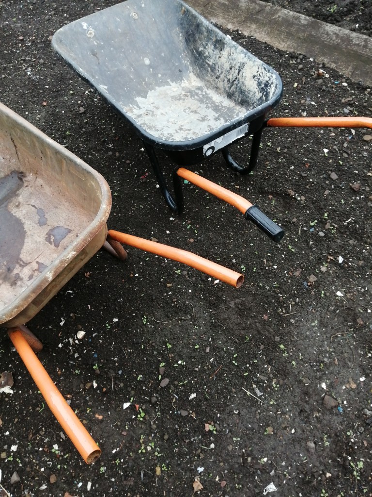 All the site wheelbarrow handles have been painted orange for identification.